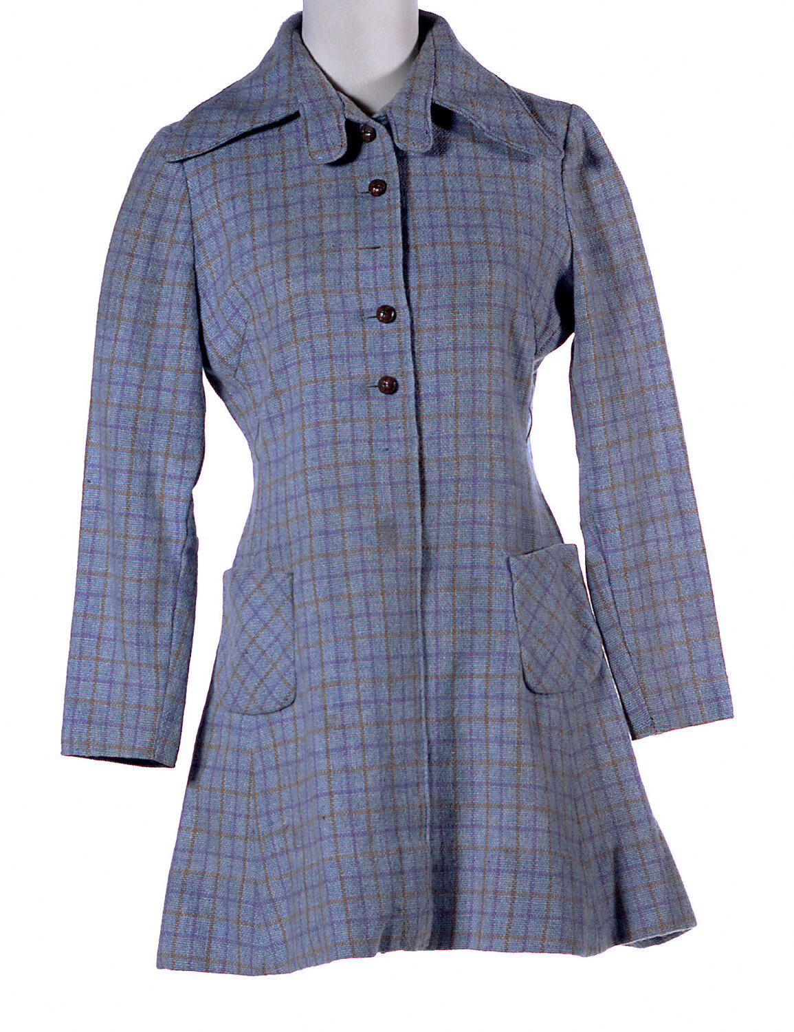 Pale blue check woollen mini dress. The check is mustard and mauve on pale blue. The dress has long sleeves, a collar and the front neck-to-waist opening is fastened with small leather buttons. Two small pockets are at hip level of the skirt front. The bodice is lined with grey polyester. The belt and one button are missing.