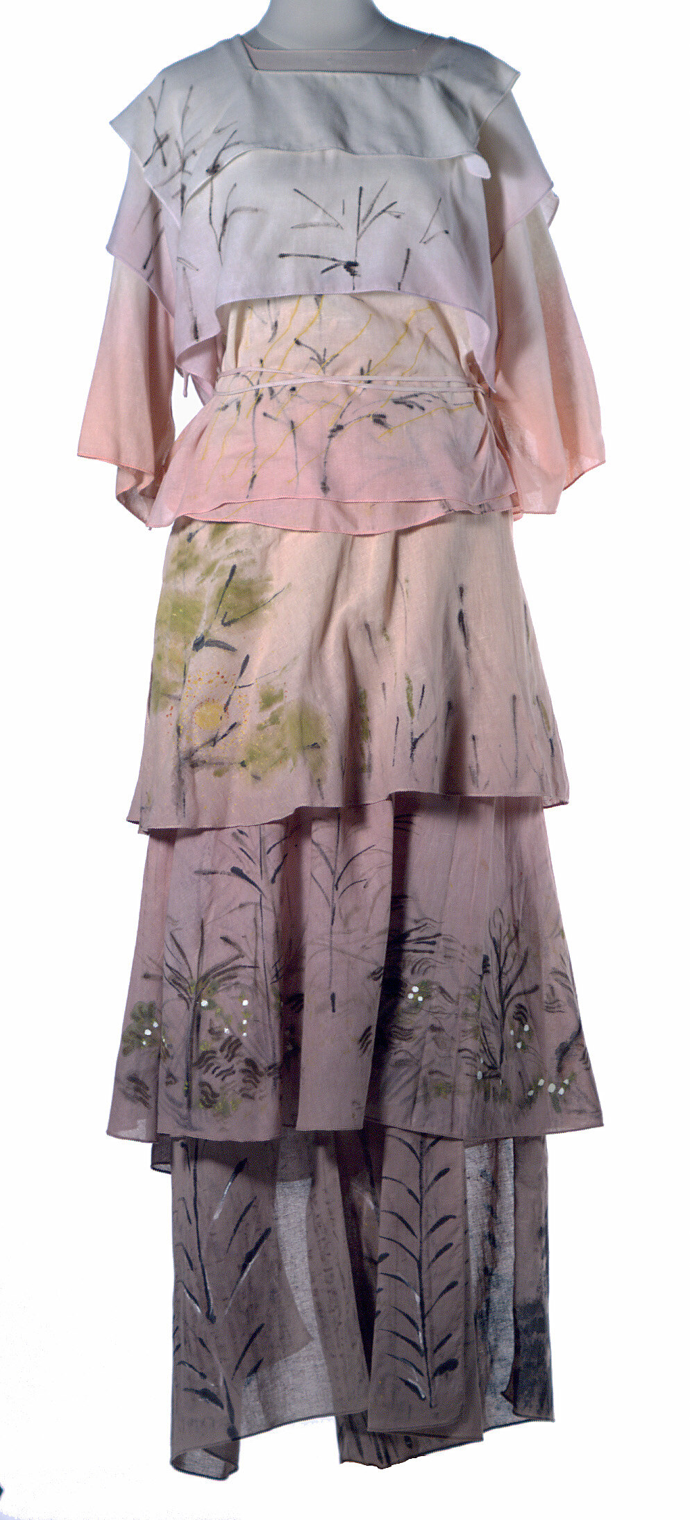 This outfit was designed and manufactured in Melbourne by Prue Acton P/L in 1975, from fabric handpainted by Rae Ganim. It is a one-off garment, and was exhibited at the National Gallery of Victoria at the opening of the exhibition `Arts Victoria 1975' as part of a `Living Canvas' presentation (they were worn by living models.) Selected fashion designers were asked to present examples of their fashion philosophy for 1975 to complement the opening of the Schofield Collection of Costumes 1760-1939, which has recently been acquired by the Gallery.