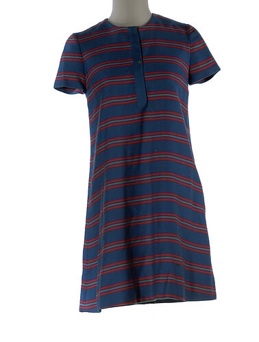 Dark blue and pink horizontal striped A-line mini dress with short sleeves. The front opening is fastened with press-studs. Has a round neckline.