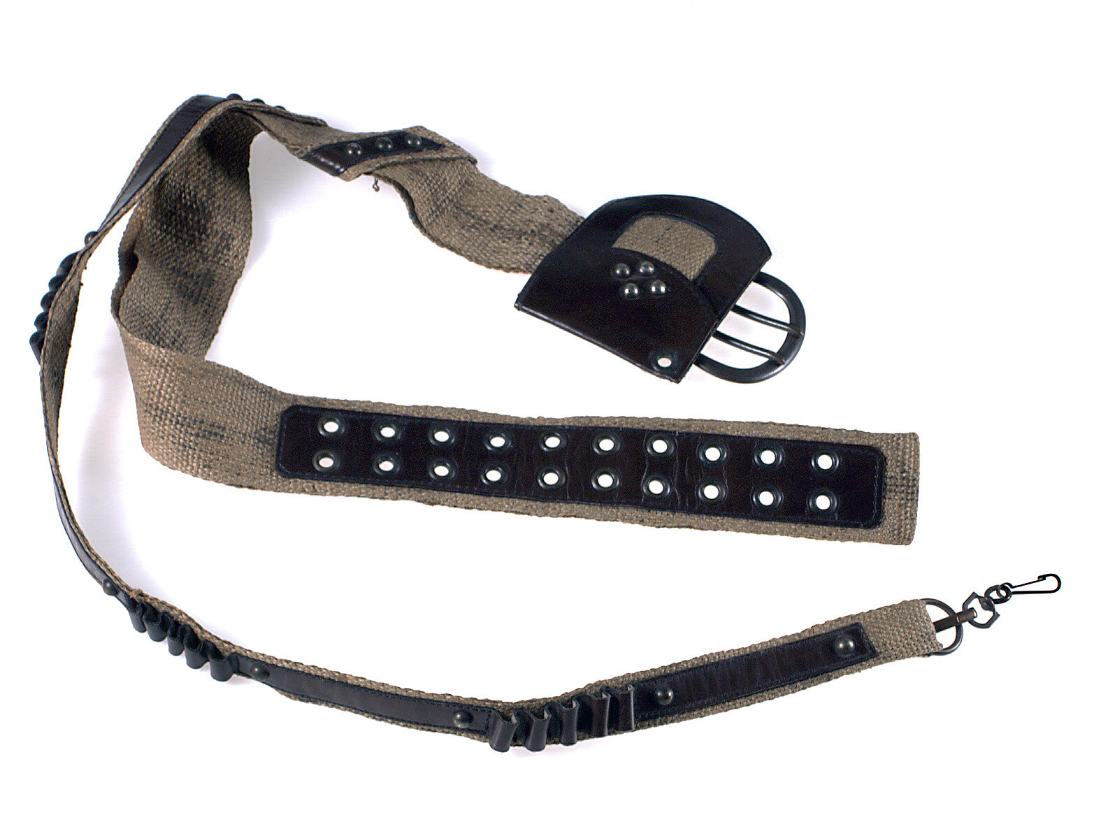 Belt of hessian decorated with leather strips, metal studs and holes ringed with metal. Large metal buckle and small purse attached at one end. Bullet holder chest strap runs diagonally across one shoulder.