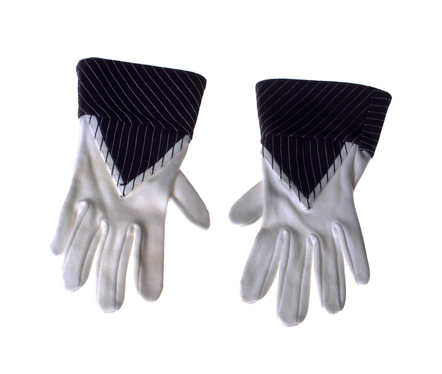 Pair of gloves. Hand and fingers in white cotton. Wrist in white and navy gro-grain decorated with white and navy stitched lines, which also creates triangle on back of hand.