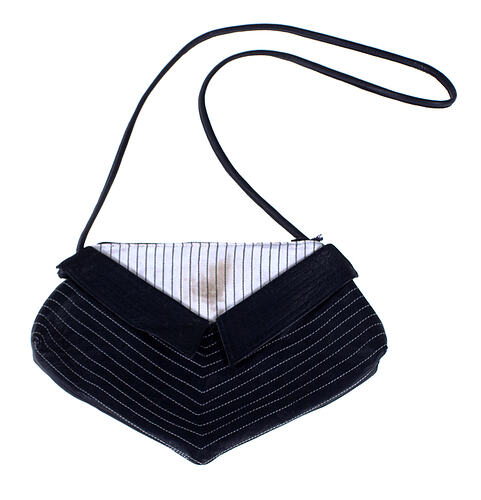 Small shoulder bag of navy blue leather and white gro-grain, decorated with navy and white stitched lines. Strap is of thick navy leather thonging. Bag is fastened at the top with a zip and is lined with leather.