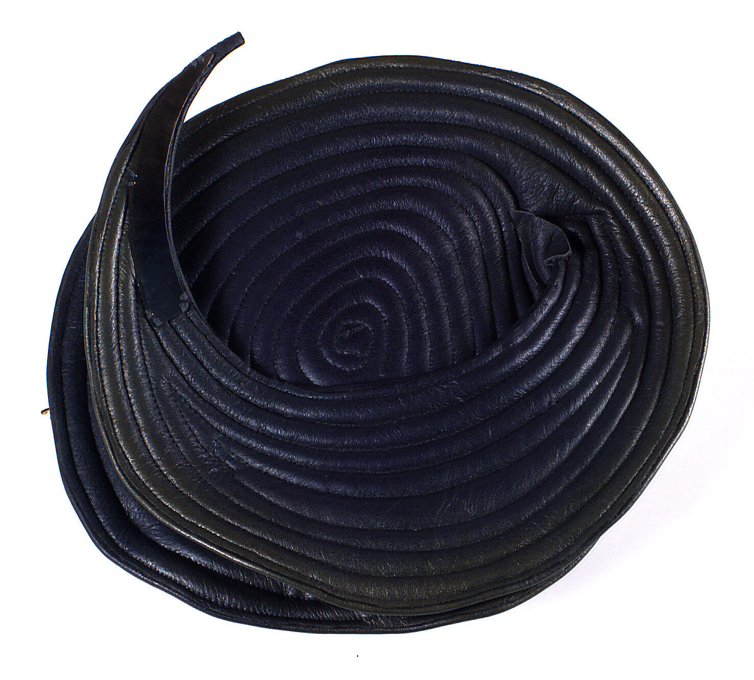 Hat consisting of a leather spiral sprayed purple and copper. Designed and manufactured in Melbourne by Prue Acton P/L in 1983, by company designer Maree Menzel. It was worn by the donor with the `Titanium' ensemble (SH 942104) to the 1983 Melbourne Cup.
