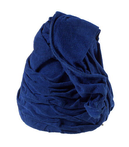 Blue 'ruched' suede conical hat. Designed and manufactured in Melbourne by Prue Acton P/L in 1985. It was worn by the donor with the 'Stained Glass' ensemble (SH 942116) to the 1985 Melbourne Cup. The theme was based on colour, inspired by stained-glass windows.