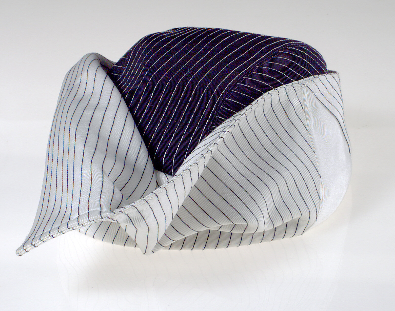 Hat in navy and white gros-grain, the navy decorated with white stitched lines and vice versa. Hat sits close to the head, the brim turned up and forming a peak at the side. Lined in white polyester. A white bobby-pin is sewn inside.