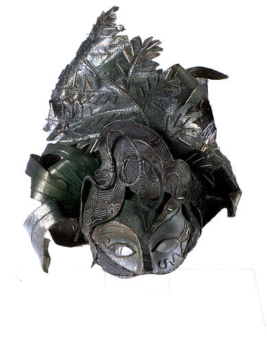 Face mask with decorative head piece made from fabric scraps in green and gold colourings.