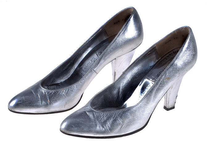 Pair of silver leather shoes with 9.5 cm high heels designed by Charles Jordan, Paris, 1983 - 1986.