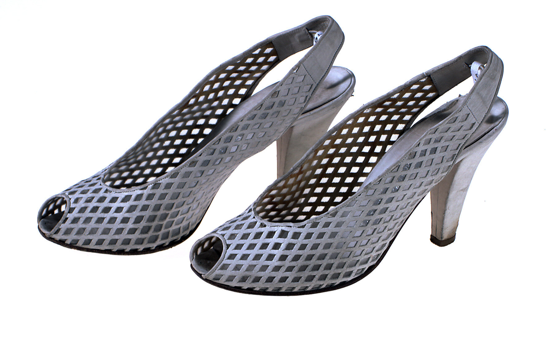Cream diamond punched suede leather shoes with peep toes and sling back heels. The uppers of the shoes are lined with clear mesh which shows through the the diamond shapes. The heels are 10cm in height. There is an elastic heel support on the inside of the sling back heel strap.