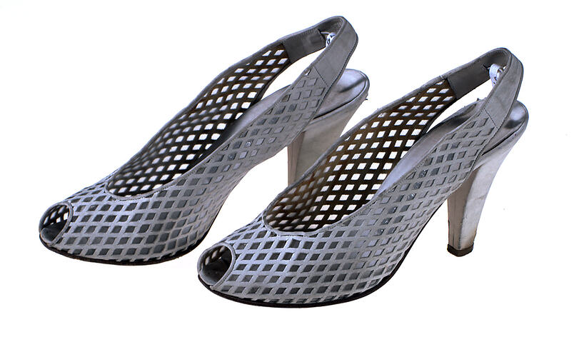 Pair of woman's cream diamond punched suede leather shoes with peep toes and sling back heels. Made by Giorgio Moretto between 1960 and 1990, the shoes were worn in Melbourne by the donor, Prue Acton.