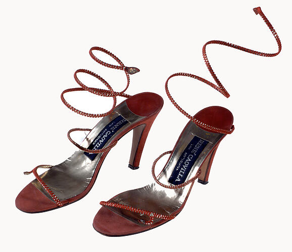 Pair of high-heeled woman's sandals in orange suede and straps of gold leather wrapped in orange thread. A spiral strap wraps around and up the ankles ending in a decorative snake's head. Made by Rene Caovilla, some time between 1960 and 1990. Worn by the donor, Prue Acton, in Melbourne.