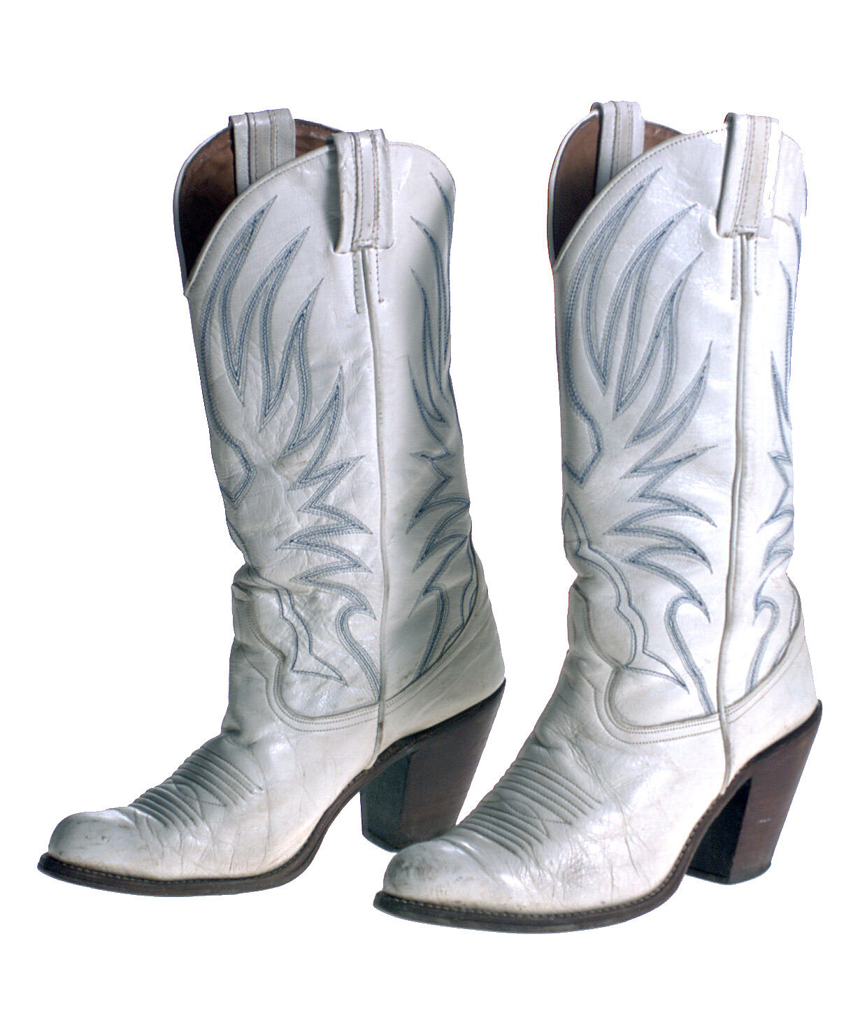 Pair of woman's cowboy boots in white leather with decorative blue and grey stitching. Made by Andrew Geller some time between 1960 and 1990 and worn by Prue Acton in Melbourne.