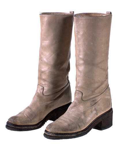 Pair of woman's beige leather boots with mottled synthetic rubber sole and heel. Made by Sergio Rossi, some time between 1960 and 1990. Worn in Melbourne by Prue Acton.