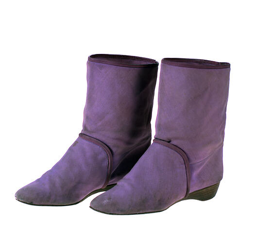 Pair of mid-calf length woman's boots with pointed toes, made of purple canvas. Made by Guido Pasquali, Italy, some time between 1960 and 1990. Worn in Melbourne by Prue Acton.