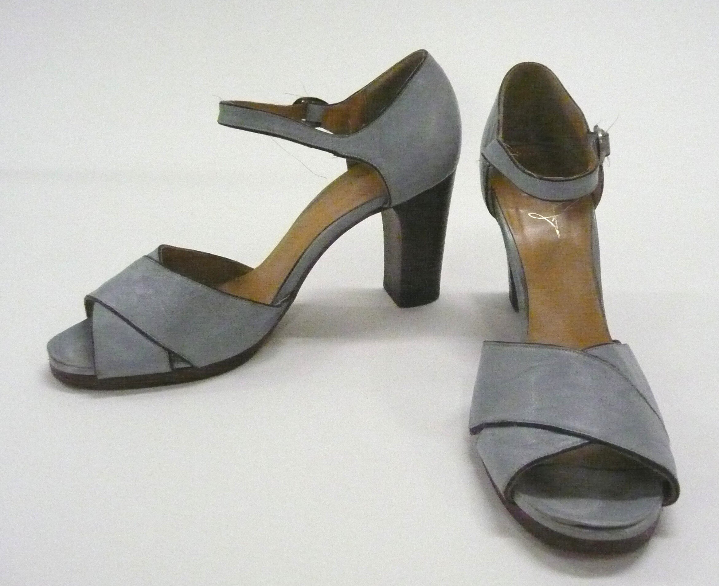 Blue leather ankle strap shoes with 8cm stacked brown leather heels. All upper edges of the shoes are edged in black.
