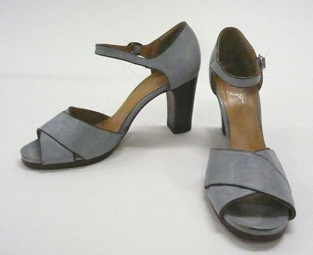 Blue leather ankle strap shoes with 8cm stacked brown leather heels, made by Prue Acton. All upper edges of the shoes are edged in black. Worn by the donor, Prue Acton, some time bewteen 1970 and 1990.