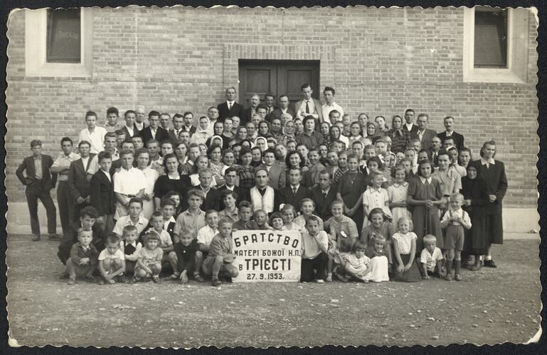 Digitised copy of a black and white photographic print of refugees from the San Saba Main Refugee camp in Trieste, Italy at the Brotherhood of Our Lady Church, 1953. Katerina Senjov is standing wearing a dark dress with white collar in third row from front, fourth from left.