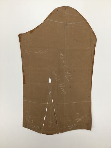 Brown paper pattern used to make garments including an cream evening dress also from this donor, Mrs Vi (Violet) Morgan (SH90.650). She dates original pattern to 1936. It has been altered over the years to accommodate changes of fashion and size. She copied the pattern whilst working at Sunbeam Manufacturing Co. as a general hand. The pattern was used until 1990.