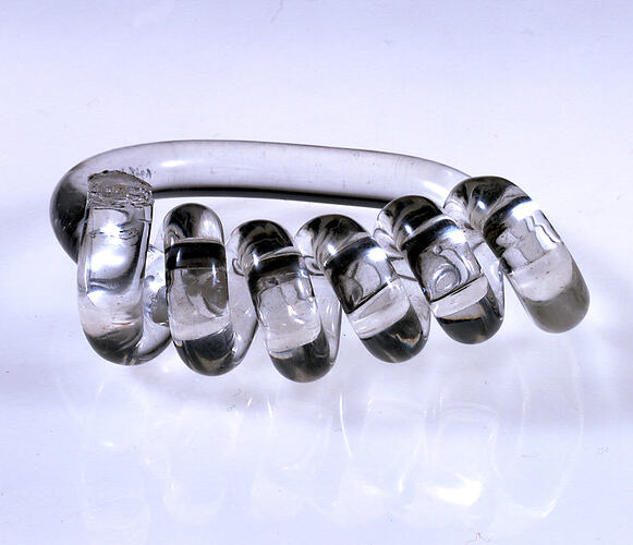 This bangle was manufactured in Melbourne by Prue Acton P/L in the 1970s. It was worn by the donor, possibly with the perspex necklace in the Museum's collection (SH 942338.)