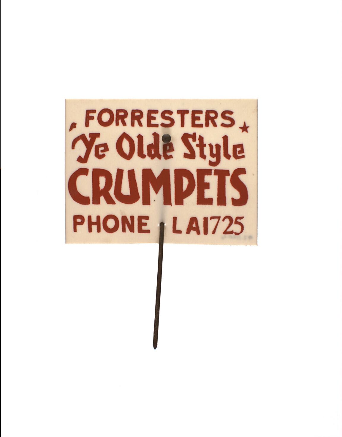 Celluloid retail sign for Forresters crumpets, used at the Old Lolly Shop, Carlton North, circa 1955-1966. The sign became obsolete with the introduction of decimal currency in 1966.