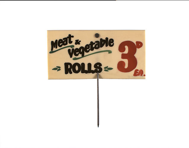 Celluloid retail sign for meat and vegetable rolls, used at the Old Lolly Shop, Carlton North, circa 1955-1966. The sign became obsolete with the introduction of decimal currency in 1966.