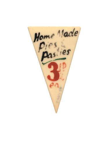 Celluloid retail sign for home made pies and pasties, used at the Old Lolly Shop, Carlton North, circa 1955-1966. The sign became obsolete with the introduction of decimal currency in 1966.