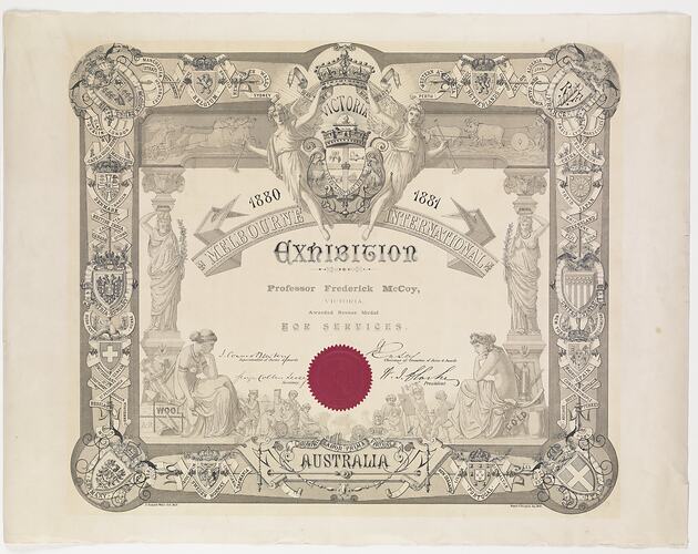 Large certificate, printed in sepia on cream paper, presented to Professor Frederick McCoy (then Director of the National Museum of Victoria) 'for Services' associated with the 1880-1881 Melbourne International Exhibition.