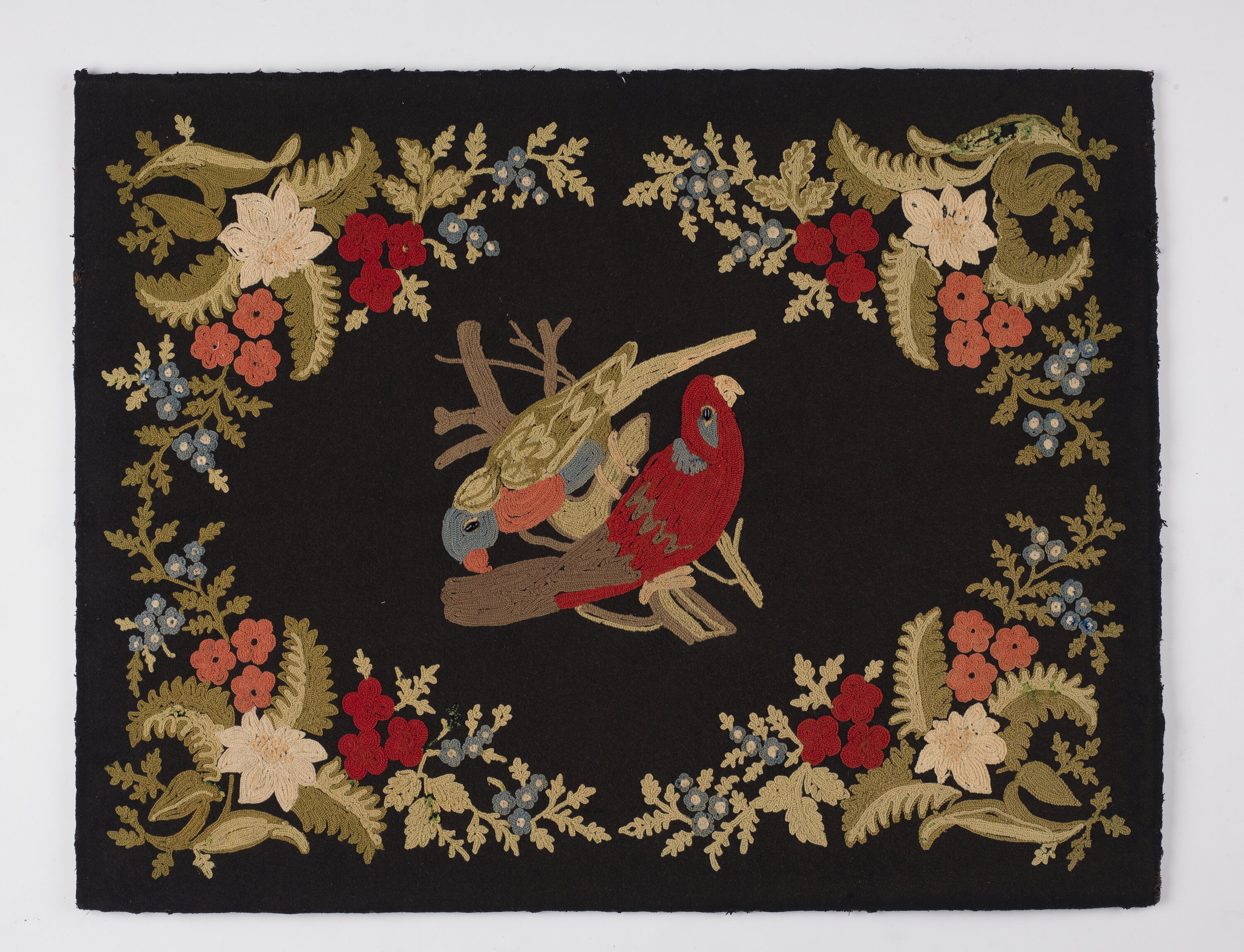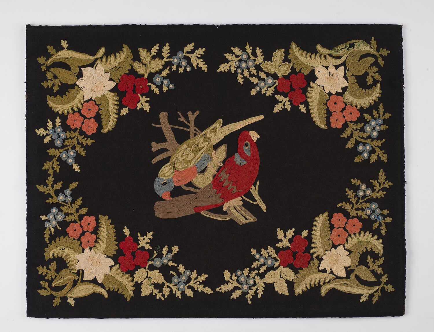 Large section of black fabric with an embroidered border of leaves and flowers, done in shades of green, red, blue, and cream. In the centre of the fabric is a embroidered picture of two parrots, one blue and brown the other red and brown.