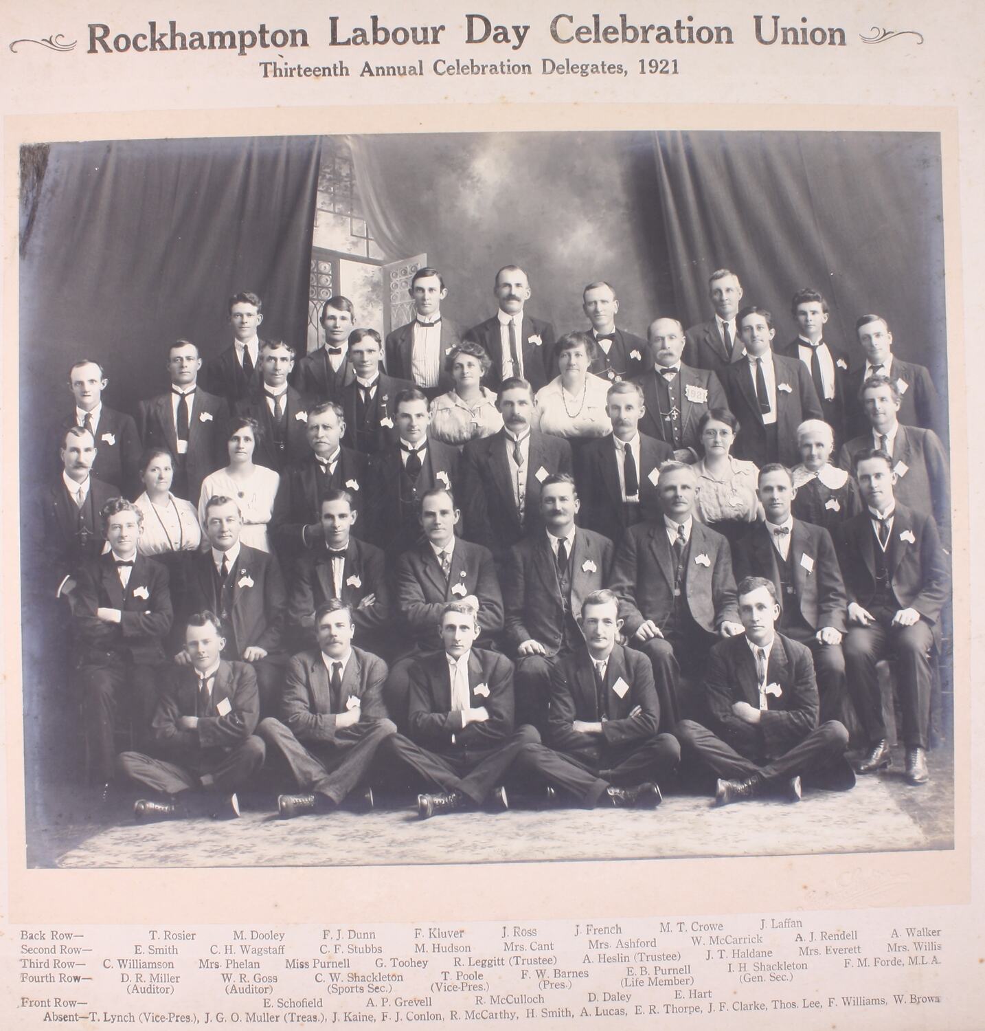 Printed, black ink: Rockhampton Labour Day Celebration Union/Thirteenth Annual Celebration Delegates, 1921. Printed, black ink: Back Row - T.Rosier M. Dodey.