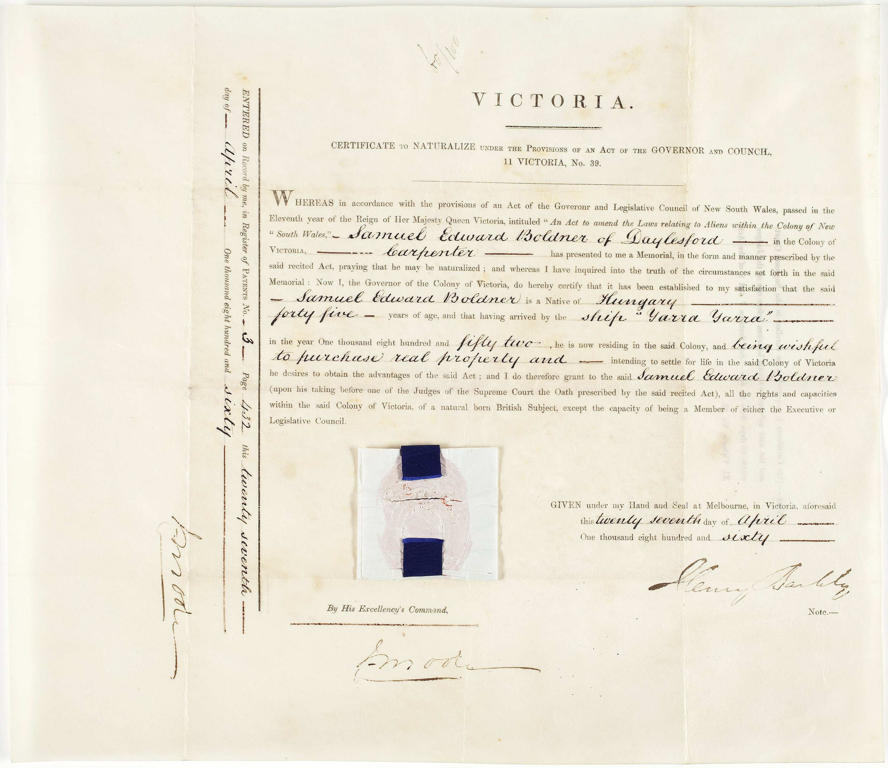 Certificate to Naturalize, issued to Samuel Edward Boldner of Daylesford, in 1860. Samuel was a native of Hungary who had arrived in Australia in 1852 on the ship "Yarra Yarra", aged 45. He need to become naturalized to be allowed to purchase real estate. Samuel worked as carpenter.