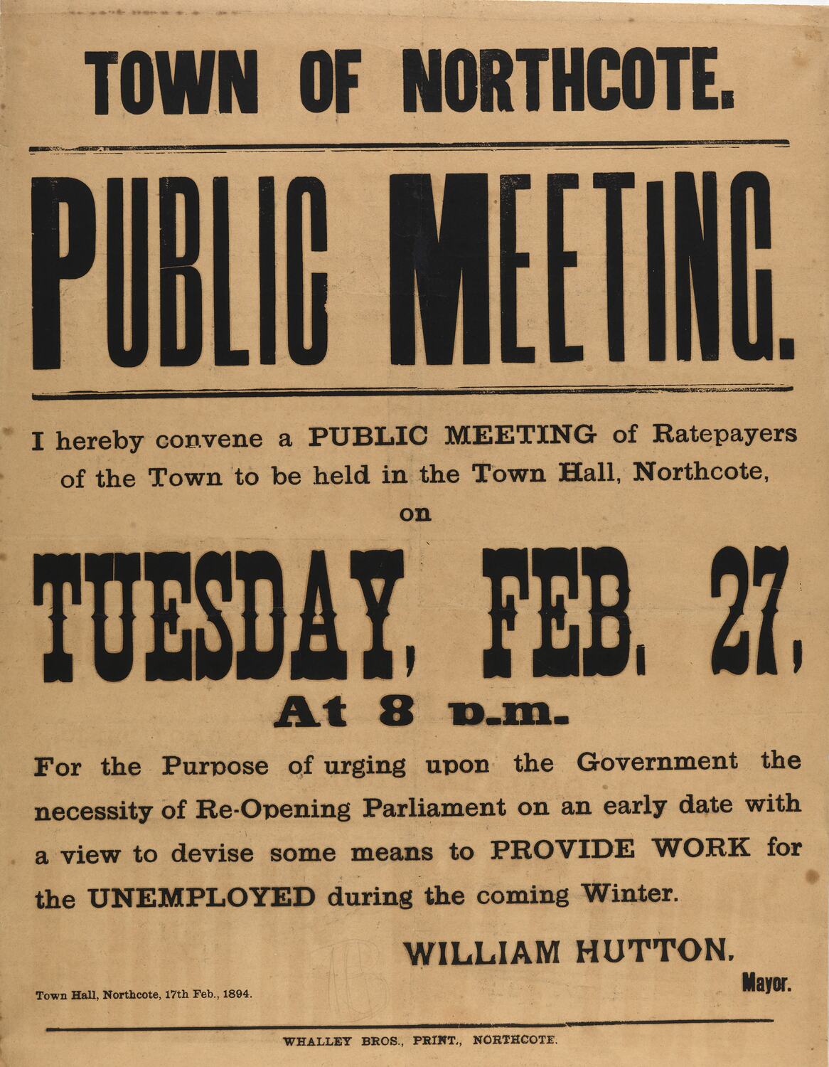 Text: TOWN OF NORTHCOTE / PUBLIC MEETING / I hereby convene a PUBLIC MEETING of Ratepayers / of the Town to be held in the Town Hall, Northcote, / on / TUESDAY, FEB. 27,/ At 8 p.m./ For the Purpose of urging upon the Government the / necessity of Re-Opening Parliament on an early date with / a view to devise some means to PROVIDE WORK for / the UNEMPLOYED during the coming Winter. / WILLIAM HUTTON, Mayor./ Town Hall, Northcote, 17th Feb., 1894. / WHALLEY BROS., PRINT., NORTHCOTE.