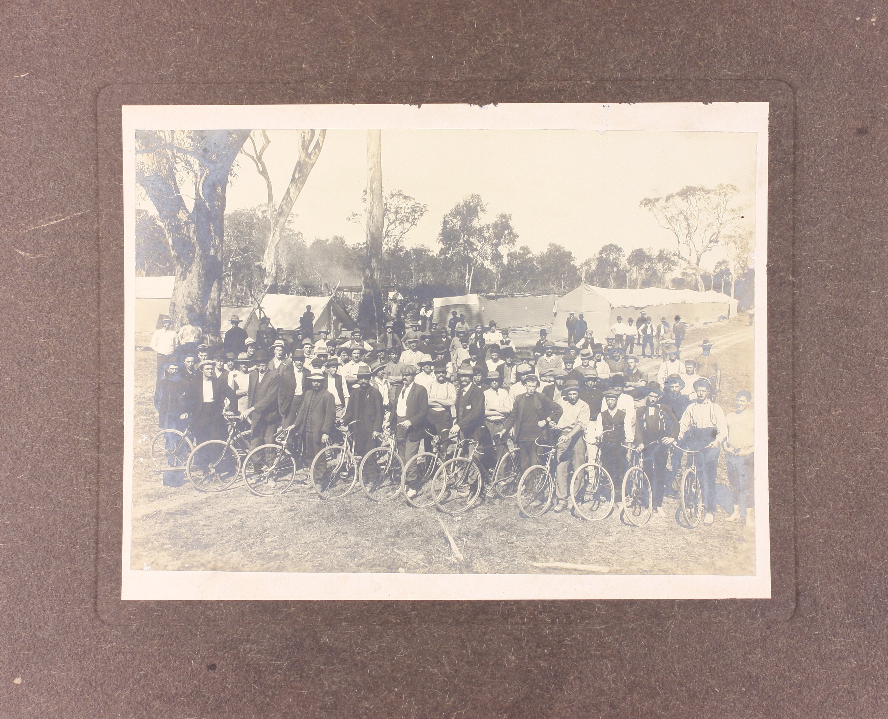 Group of approximately 100 men standing in a field. Men at the front have bicycles. In the background are tents and trees.