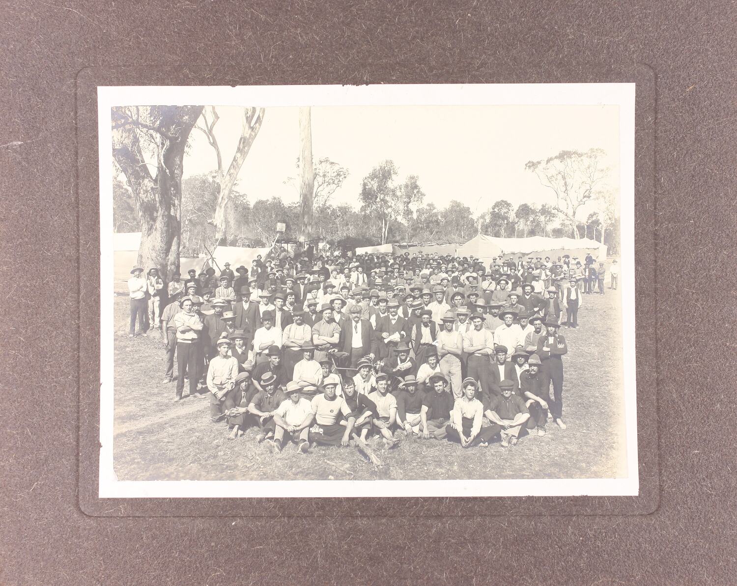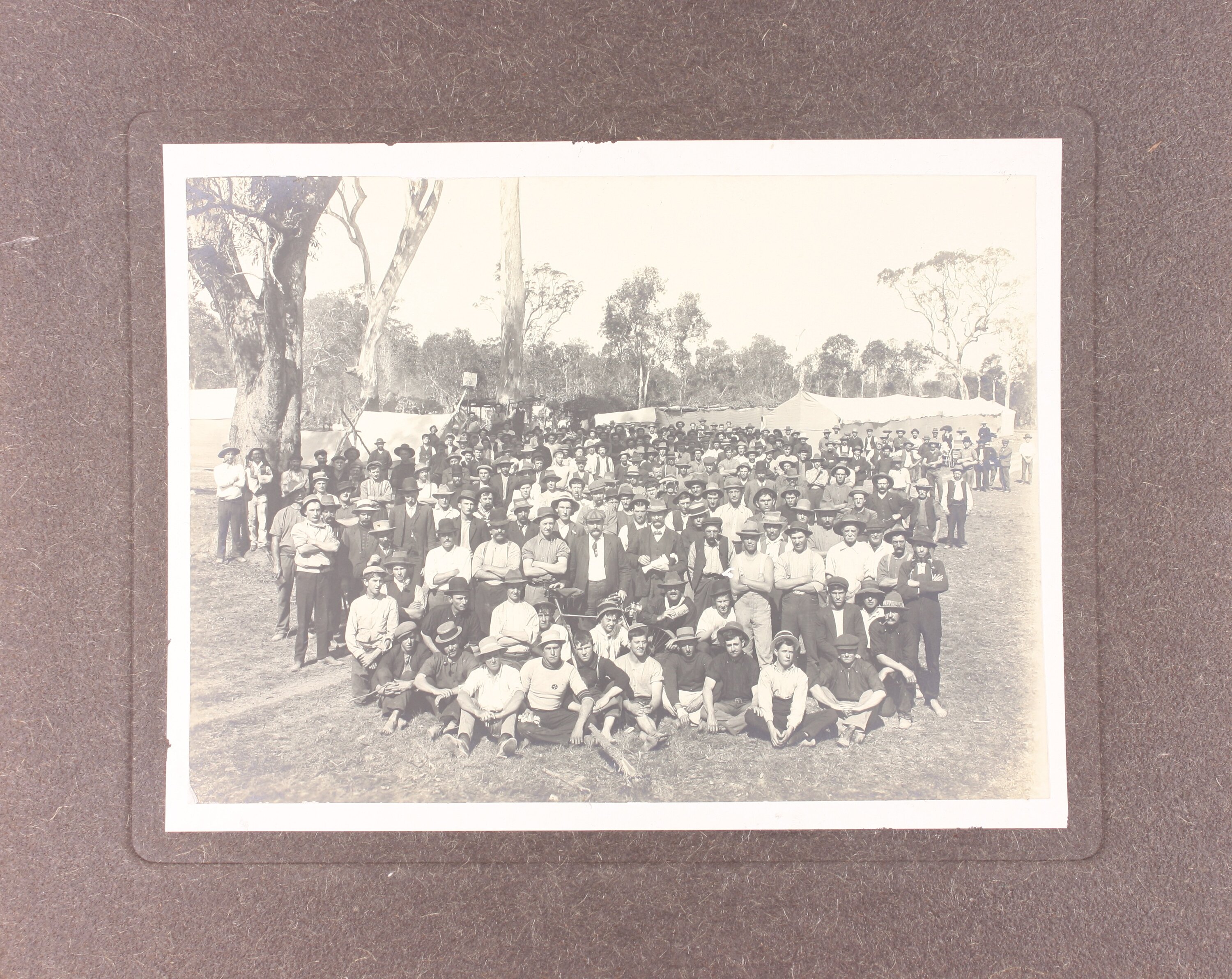 Mounted photograph of strikers at the Amalgamated Workers Association (AWA) strike camp in Queensland. The photograph was taken during strikes held by Queensland's sugar workers between June and August 1911. Industrial action was taken in support of an eight hour day, modification to the cane-cutting agreement and a minimum wage of 7 1/2d. per hour. This is the same photograph as SH 901159.