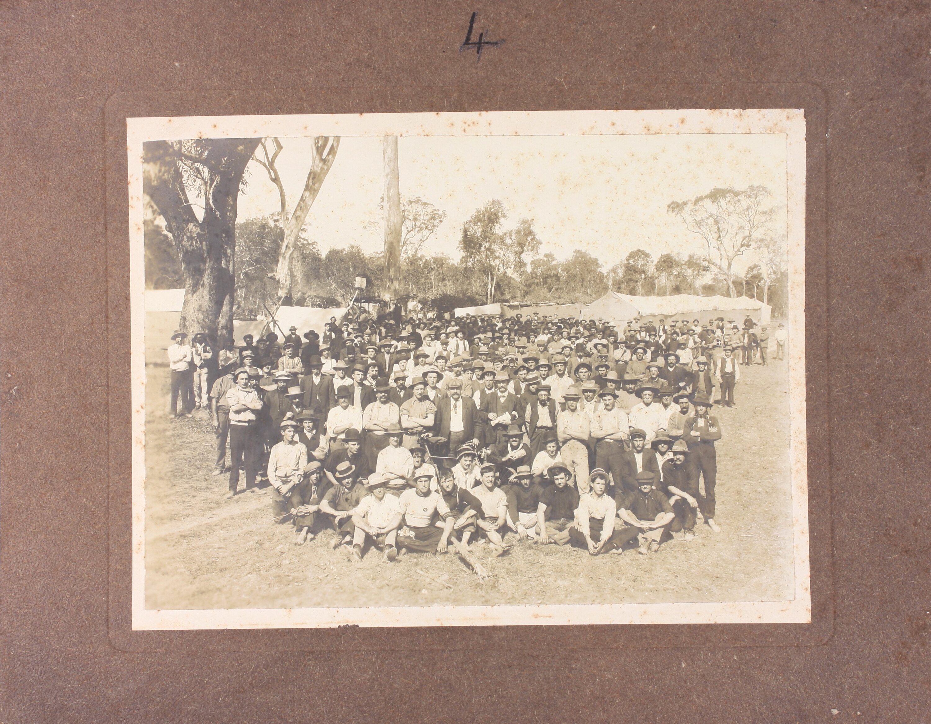 Mounted photograph of strikers at the Amalgamated Workers Association (AWA) strike camp in Queensland. The photograph was taken during strikes held by Queensland's sugar workers between June and August 1911. Industrial action was taken in support of an eight hour day, modification to the cane-cutting agreement and a minimum wage of 7 1/2d. per hour. This is the same photograph as SH 901158.