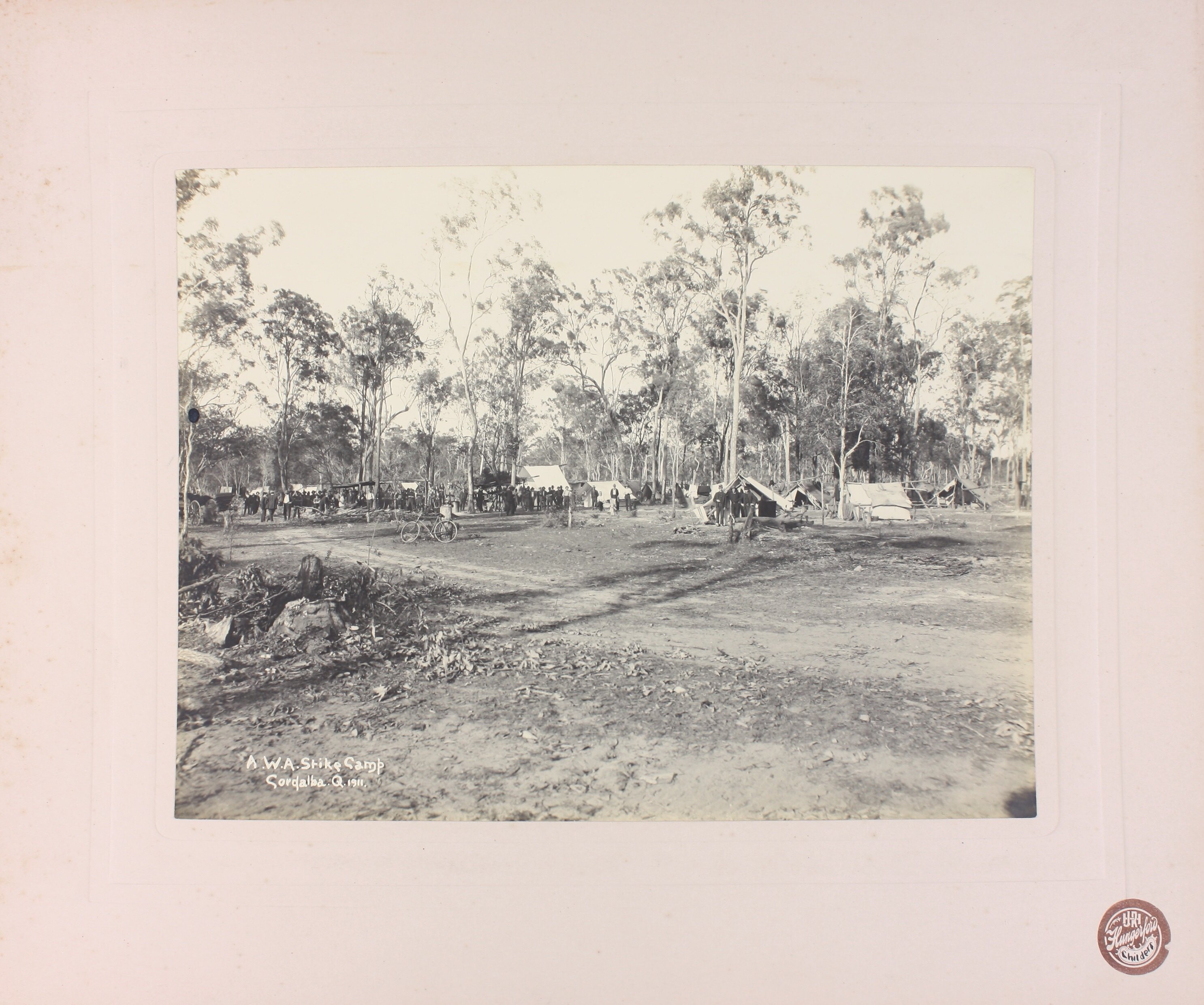Text on photograph: "A.W.A Strike Camp / Cordalba, Q. 1911" Text on stamp in bottom right corner: "J.R Hungerford / Childers"