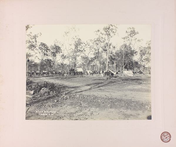 Mounted photograph of strikers at the Amalgamated Workers Association (AWA) strike camp in Queensland. The photograph was taken during strikes held by Queensland's sugar workers between June and August 1911. Industrial action was taken in support of an eight hour day, modification to the cane-cutting agreement and a minimum wage of 7 1/2d. per hour.