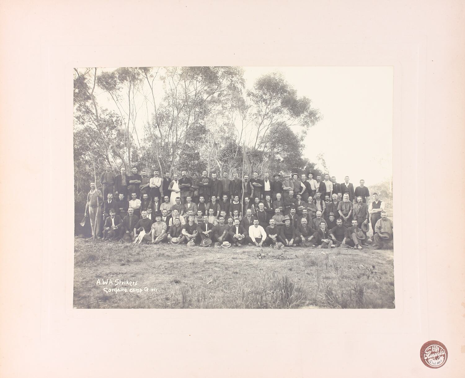 Mounted photograph of the strikers from the Amalgamated Workers Association's camp in Cordalba, Queensland. The photograph was taken during strikes held by Queensland's sugar workers between June and August 1911. Industrial action was taken in support of an eight hour day, modification to the cane-cutting agreement and a minimum wage of 7 1/2d. per hour. This is the same image as SH 901163.