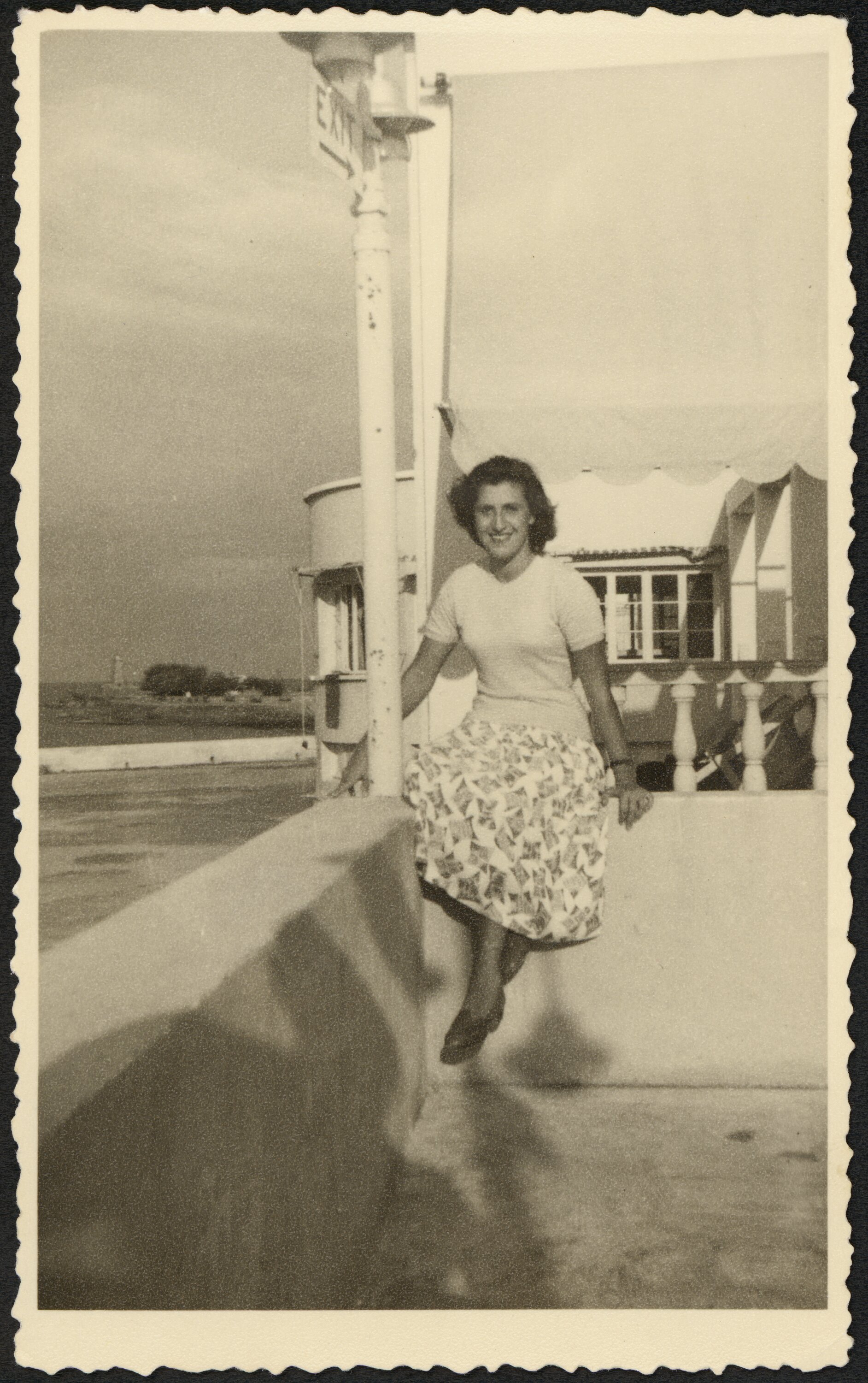 Digital black and white image of Adeline Del Vecchio seated outside her family home near the sea in the suburbs of Alexandria, Egypt, circa 1950.