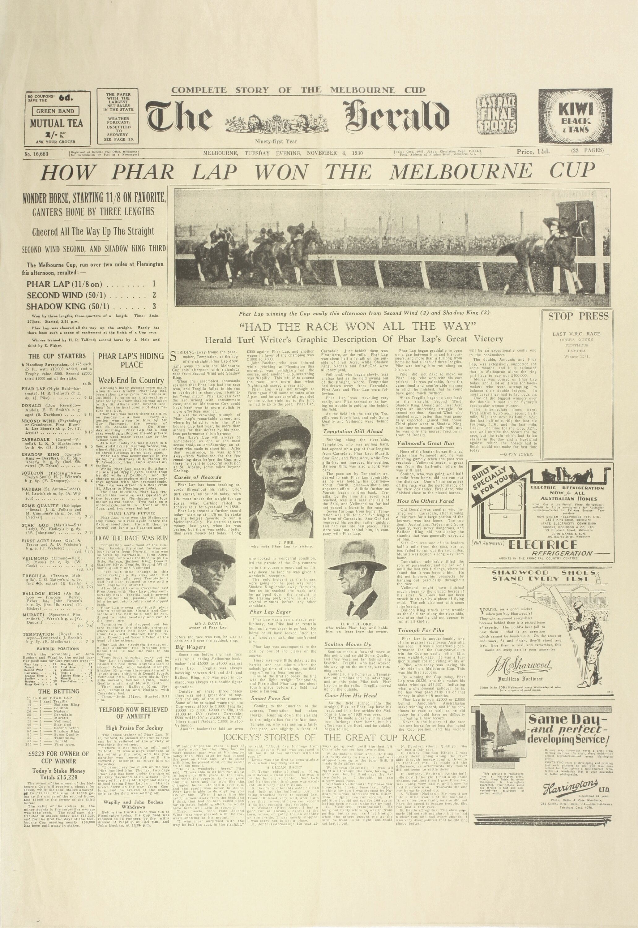 Printed in black ink on front: COMPLETE STORY OF THE MELBOURNE CUP/ THE HERALD/ MELBOURNE, TUESDAY EVENING , NOVEMBER 4, 1939/ HOW PHAR LAP WON THE MELBOURNE CUP. (followed by extensive text.)