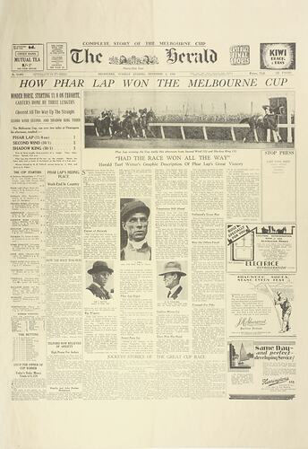 Large A2 sized poster printed on yellow newsprint. It shows a full-sized reproduction of the front page of the Herald newspaper, dated Tuesday 4th November, 1930, containing a story of how Phar Lap won the 1930 Melbourne Cup, along with three advertisements and the newspaper masthead.