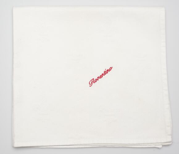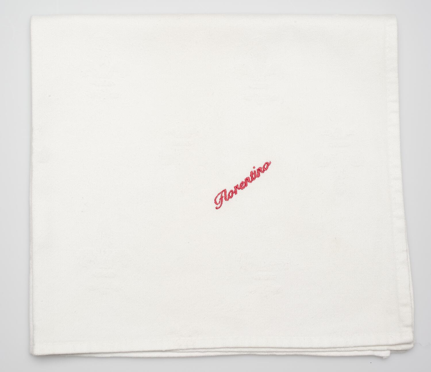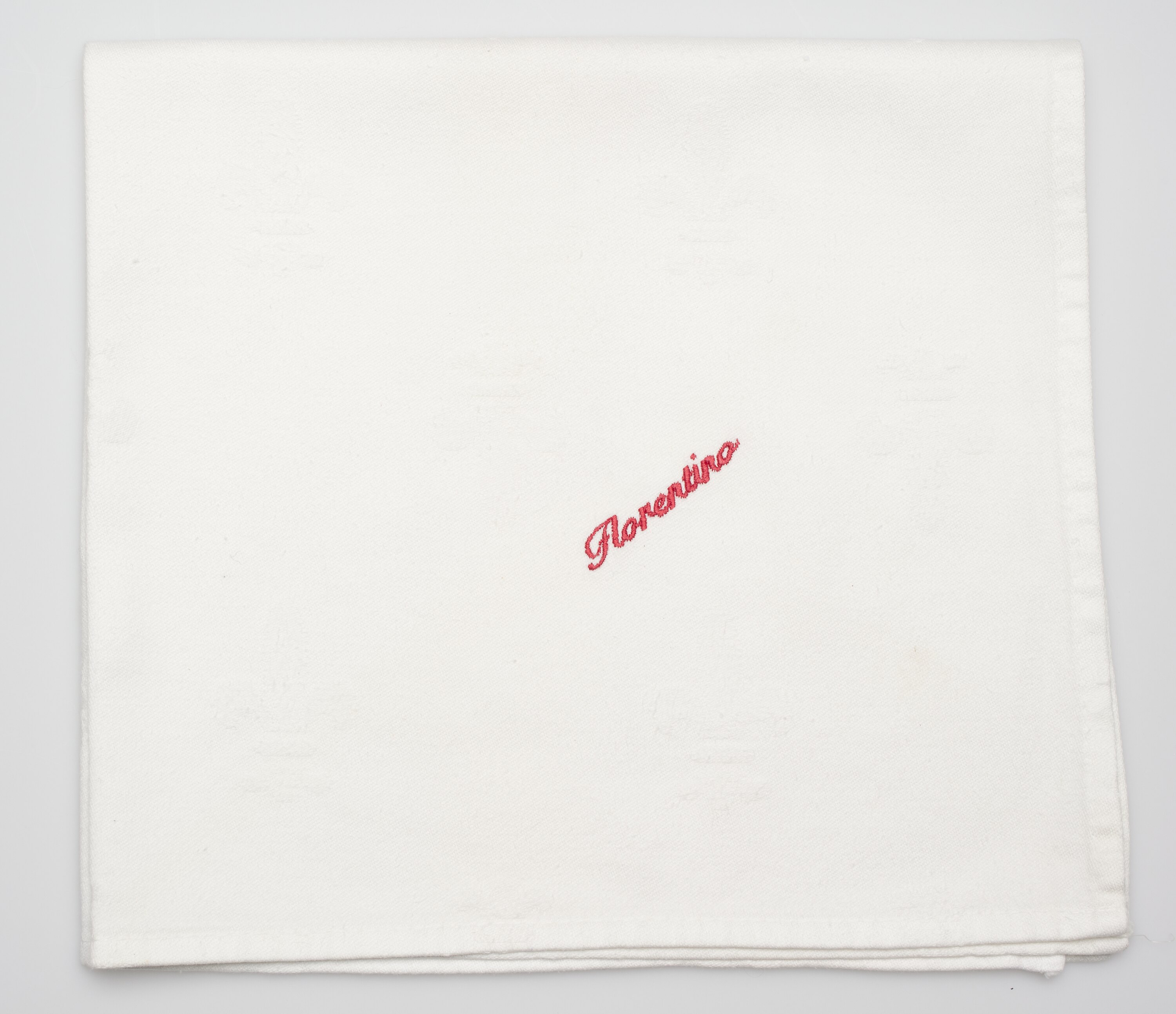 This white cotton napkin is part of the furnishing and equipment used at Florentino Restaurant in Bourke Street Melbourne, during the time of Branco Tocigl's ownership from 1979-1989.