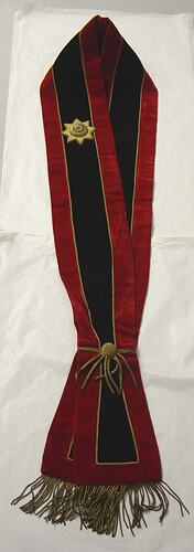 Sash of black velvet with red velvet border. Front of sash has embroidered gold medallion of gold bullion and sequins in the form of an 8-point star with raised centre. Front and back of sash cross over below hip and are joined with gold cord and decorated with gold bullion covered button and tassels. Ends of sash trimmed with gold fringe. Sash is lined with polished red cotton.