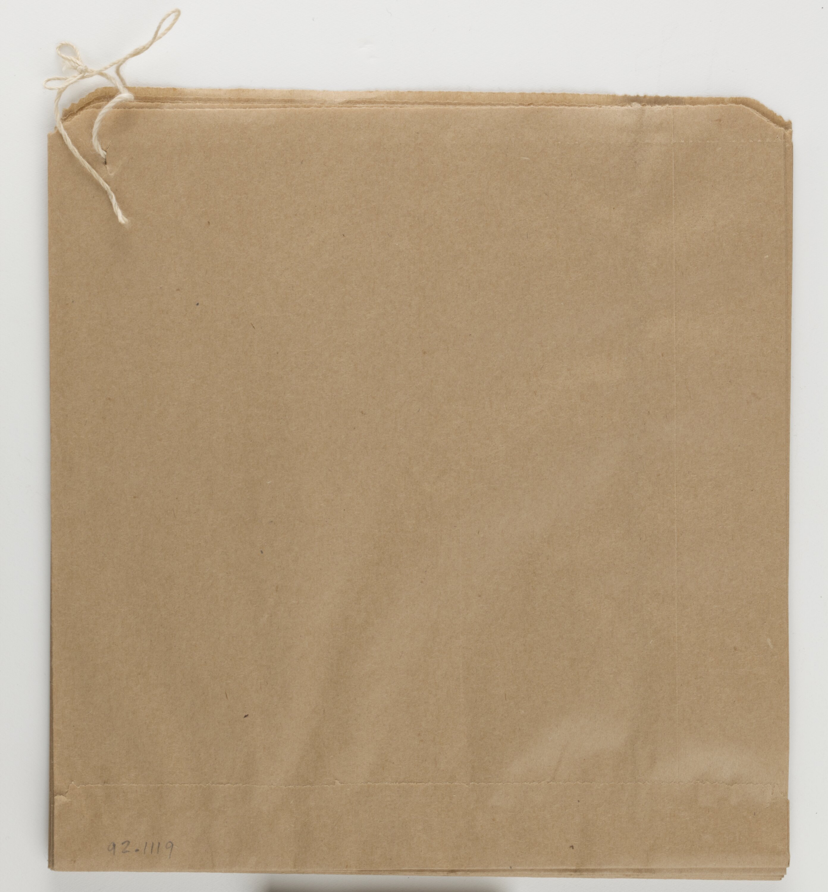 Bundle of eleven brown paper bags fastened together with a piece of string.