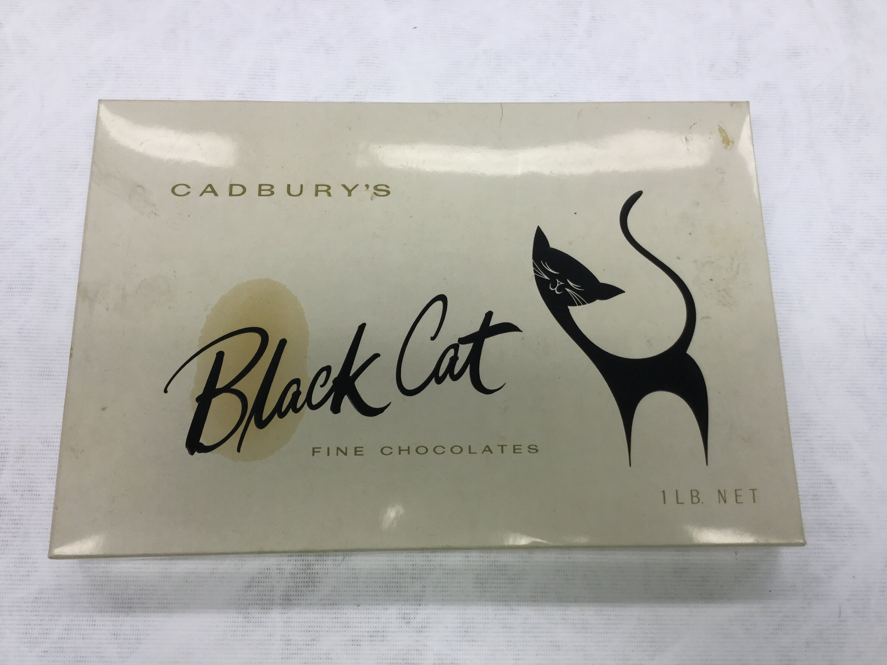 White cardboard chocolate box to contain one pound of chocolates. Cadbury's Black Cat trade mark, cat design on top of lid.