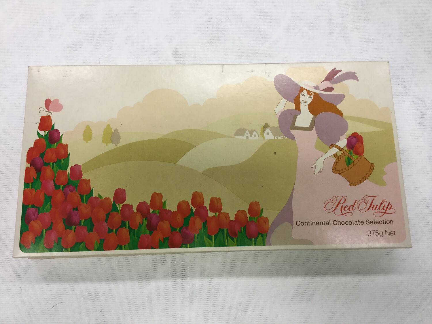 Printed top of lid: Red Tulip, Continental Chocolate Selection/ 375g Net. Printed side of lid: RED TULIP CHOCOLATES PTY.LTD., 201 HIGH STREET, PRAHRAN, VICTORIA, AUSTRALIA/MADE IN AUSTRALIA. Printed side of lid list of ingredients. Printed label base of box: USE BY/05NOV81.