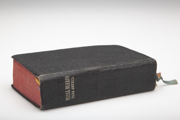 Libro de misa escrito en español, usado en Argentina, hacia 1958 - 1965, por Martha Pregal. Fue uno de los pocos artículos que Martha trajo consigo cuando ella emigró de Argentina a Australia en 1965. Martha, su esposo y sus dos hijos vinieron a Australia porque vieron que tenía más oportunidades, y el esposo de Martha, de Calabria, ya tenía familiares aquí. Aunque Martha se había graduado como maestra en 1957 en Argentina, a su llegada a Melbourne trabajó en la fábrica de Gloweave.