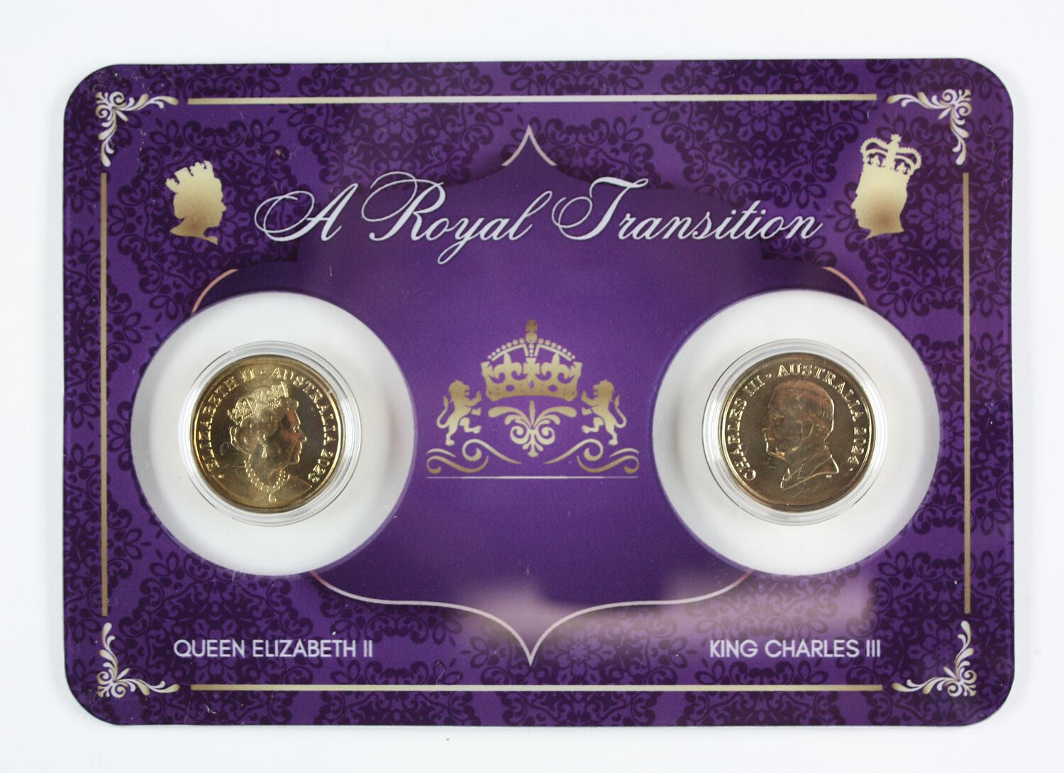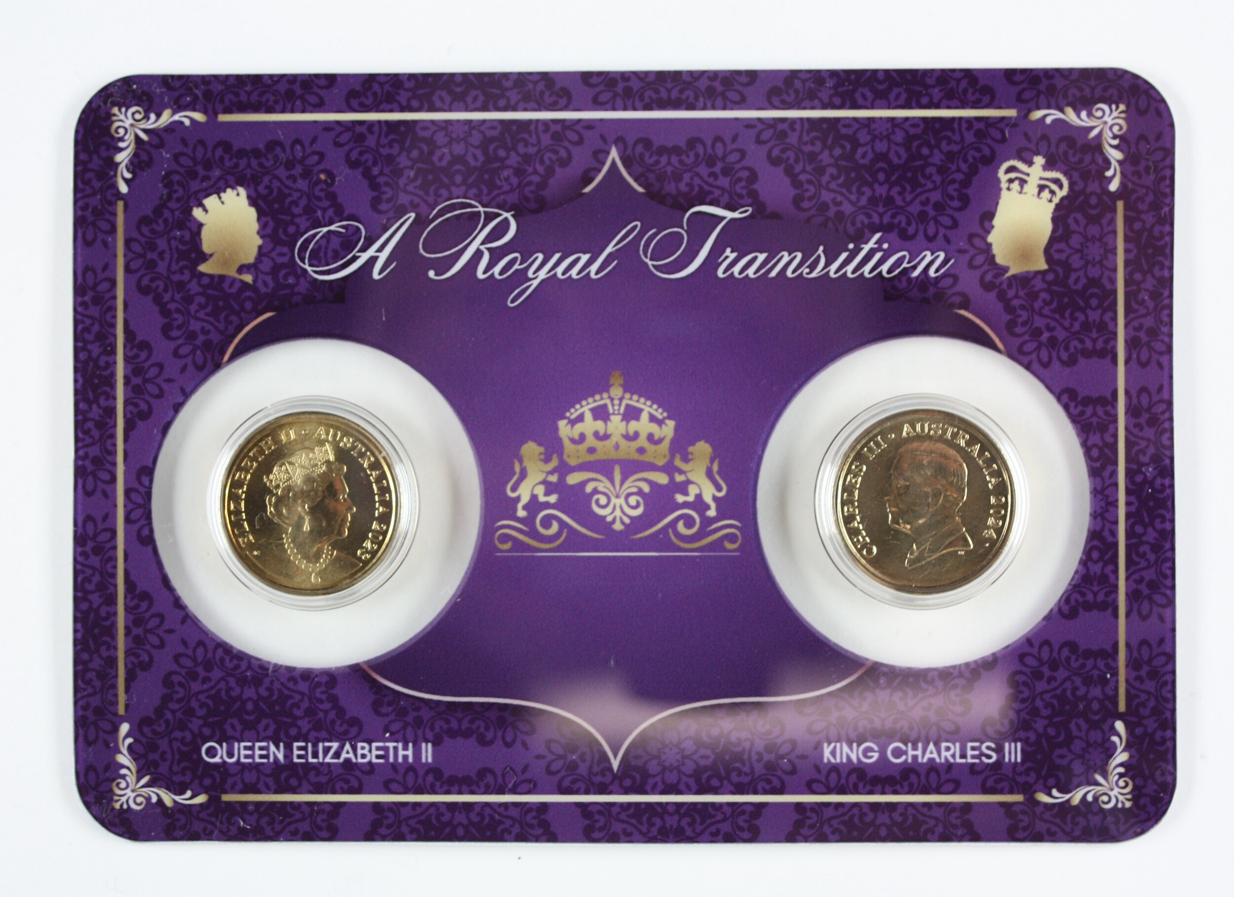 On front of card: A Royal Transition / QUEEN ELIZABETH II / KING CHARLES III On back of card: LIMITED EDITION / 248 / 250 / THE UNWAVERING / COMMITMENT TO DUTY, TRADITION & PUBLIC SERVICE / OF QUEEN ELIZABETH II / HAS INSPIRED PEOPLE / AROUND THE WORLD. / HER SUCCESSOR, KING CHARLES III, WILL HONOUR / THE TRADITIONS / OF THE PAST. WHILE EMBRACING / THE CHALLENGES / & OPPORTUNITIES / OF THE FUTURE. / NOMINAL SPECIFICATION / Denomination: $2 / Metal: Al-Br / weight: 6.60 g / Diameter Finish: 20.50 mm / Struck by: Royal Australian Mint / CoinCard SECURITY CASE - BY CERTILINE OF ITALY / Packaged by [Logo] Max Stern & Co