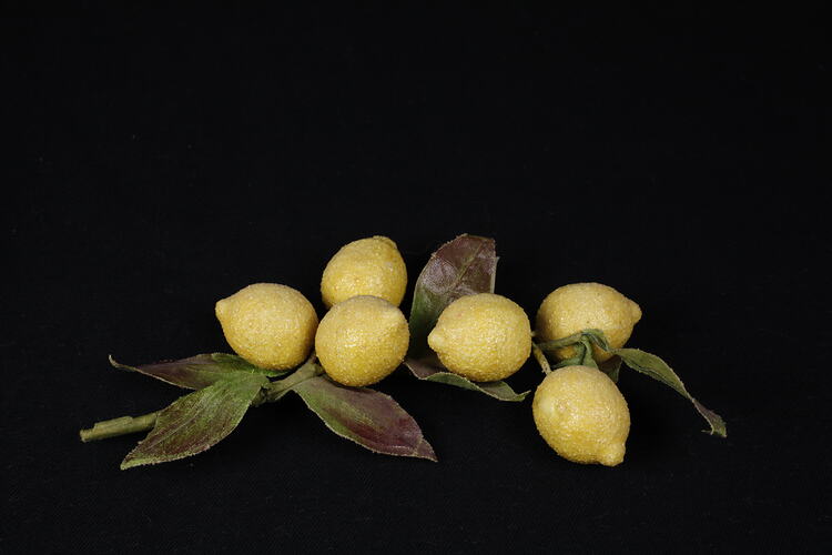 Small bunch of artificial lemons, for decorating a hat, made in France. Acquired for use in millinery by Miss Edith M. Barnett.