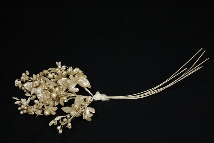 Large spray of cream-coloured wax flowers, on long stems of cloth-covered wire. There are wax leaves among the flowers, and some of the leaves have a green-coloured wax dot on them. There are also some round wax shapes representing seeds. The flowers are fastened to six stems, tied together with a piece of satin.