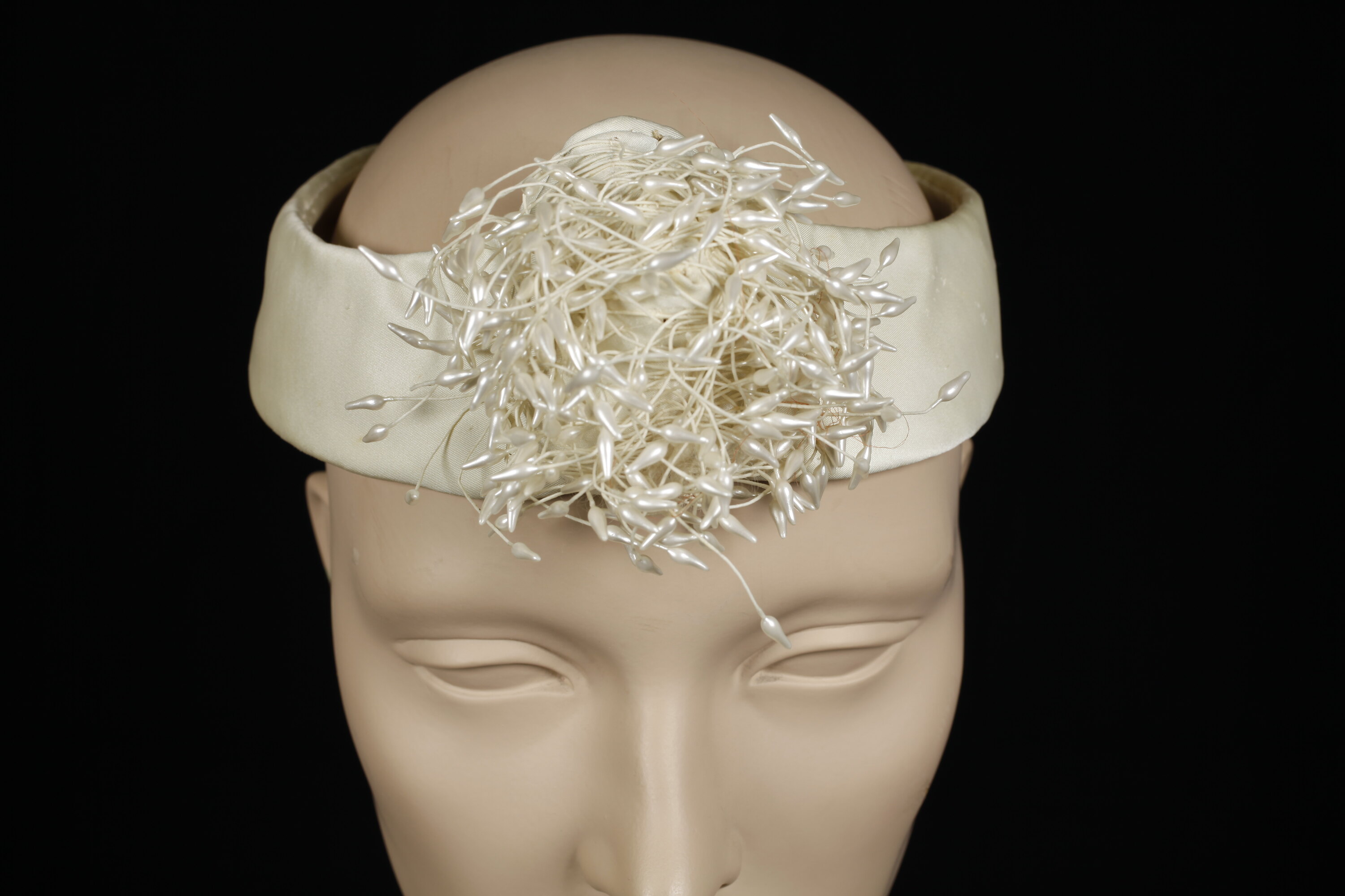 Satin-covered round headdress, in cream, with a bunch of "flowers" made of pearls in the front. The headdress would have sat on top of the head, and could have had a veil attached.
