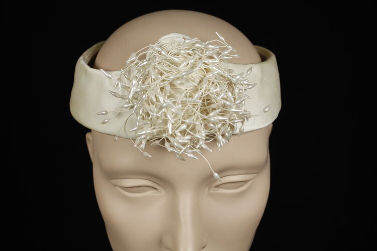 Satin-covered round headdress, in cream, with a bunch of "flowers" made of pearls, possibly for bridal veil. Believed to have been made by Miss Edith M. Barnett.